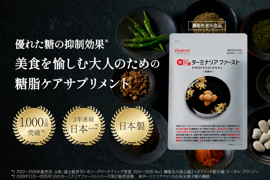 糖脂ケアサプリメント「ターミナリアファースト」は、糖質と脂質の吸収を抑えてくれる効果があるため、糖質や脂質を摂り過ぎてしまう方やダイエット中であっても食事を思う存分愉しみたい方、バランスの良い食事をしたい方におすすめです。