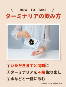 ターミナリアファーストは食事とともに「4粒」飲んだ場合に効果を確認しています。そのため「食事とともに1回4粒目安」でお召し上がりください。