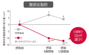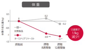 臨床試験においては、1日2回食前などに継続して飲むことで、12週間後に体重を1.1kg、腹部全脂肪面積を12c㎡減少させたとの報告がございます。