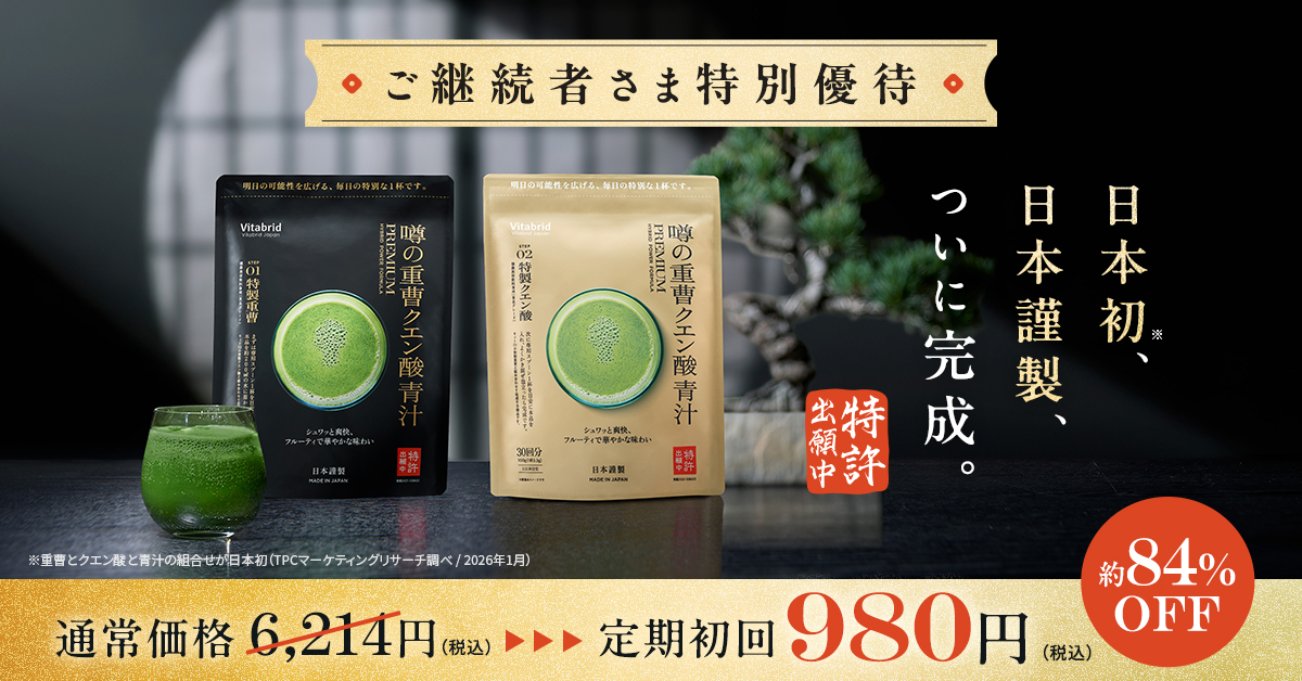 ビタブリッド製品をご継続いただいているお客さま限定で「噂の重曹クエン酸青汁」の本商品(1セット)をお一人様一回限り定期初回980円(税込)にてご注文いただけます。