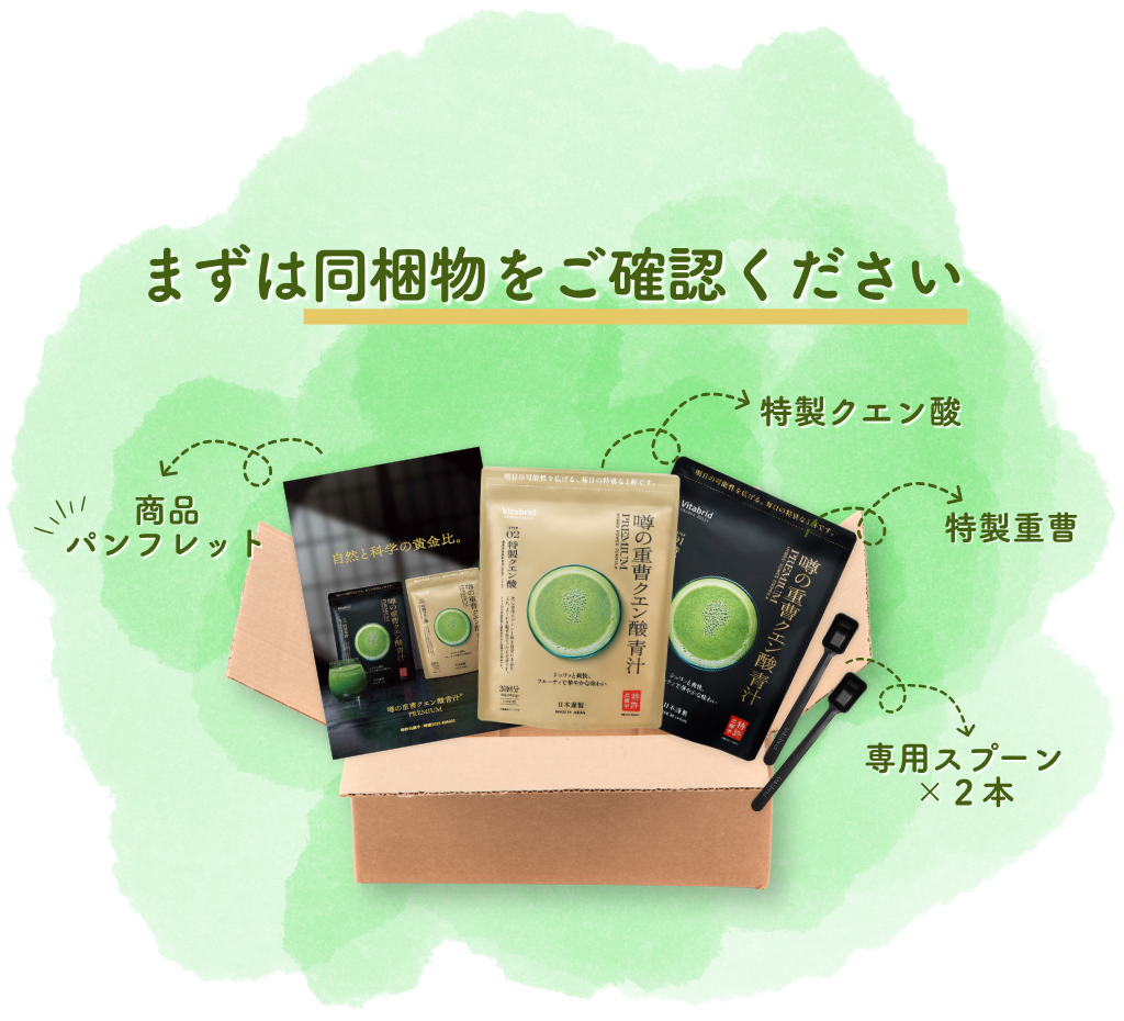 お届けする箱の中には、『重曹クエン酸青汁』の魅力やおいしい飲み方をまとめたパンフレットが入っています。