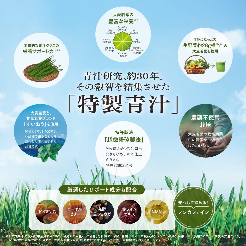 本製品には、生野菜約28g相当※1(製品1食分)の「大麦若葉」を配合 。