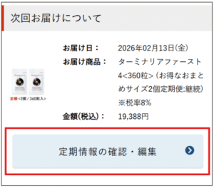 ➀マイページにログイン後、「次回お届けについて」から「定期情報の確認・編集」を選択