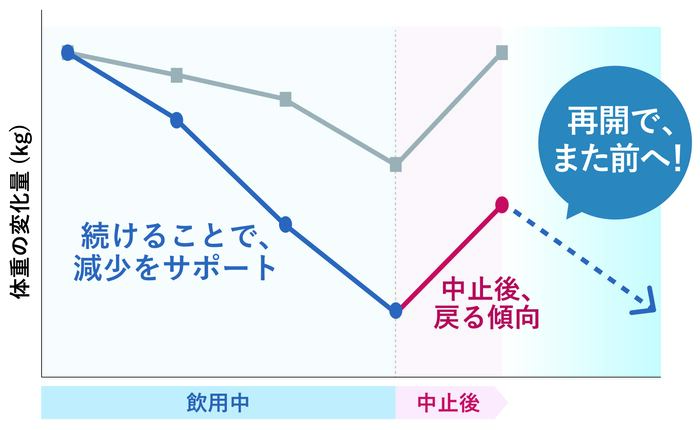 研究でも「飲用を中止すると体重が戻りやすい」傾向が見られています。つまり、飲んでいる間は体重をキープできていた可能性が高いということ!