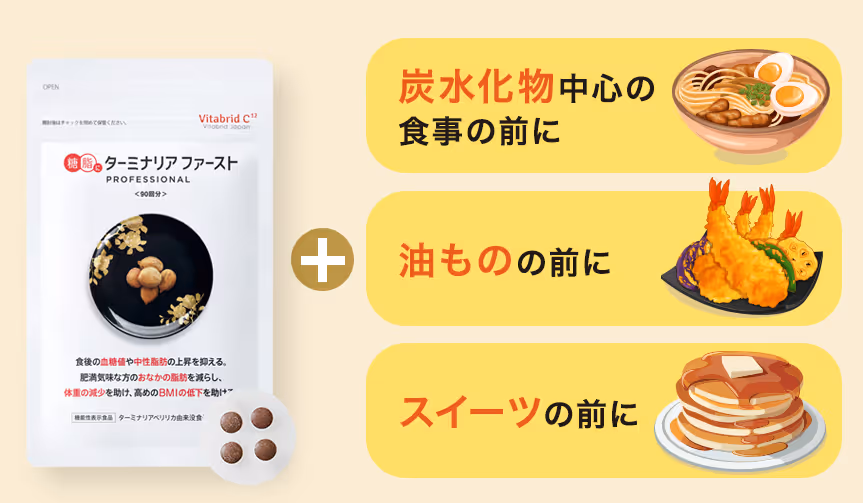 【試験概要】試験デザイン:ランダム化二重盲検プラセボ対照並行群間比較試験 摂取期間:12週間(4Wごとに検査)+後観察4週間 摂取タイミング:食事とともに試験食品を摂取(1日2回)対象者:BMI23以上30未満、20歳以上65歳未満の健常男女 解析対象者数:被験食品[アクティブ]41名、対照食品[プラセボ]42名 試験開始前と同様の生活を送ること、過度の飲酒をしないこと、夕食後2時間以内に就寝しないこと、22時以降間食を含む食事の摂取をしないこと、各食事の間隔を3時間以上あけることなどを、試験期間を通じての注意事項として被験者に説明した。 被験食品[アクティブ]:ターミナリアファースト プロフェッショナル4 対照食品[プラセボ]:被験食品中のターミナリアベリリカ抽出物をカラメルに置き換え 松岡ら:薬理と治療, 53(4), 331-8, 2025