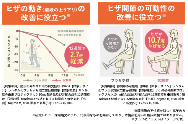 サケ鼻軟骨由来プロテオグリカンはひざの動きの改善やひざ関節の可動性の改善に役立つことが報告されています。