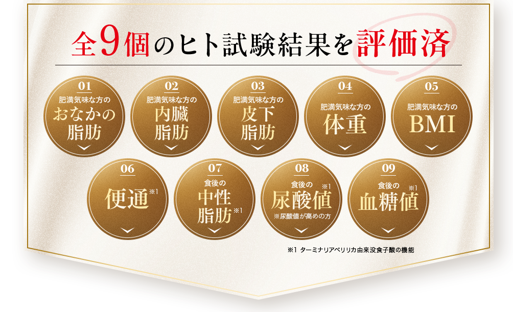 ターミナリアファーストの主成分である、「ターミナリアべリリカ由来没食子酸」には、9つもの機能性が確認されています。