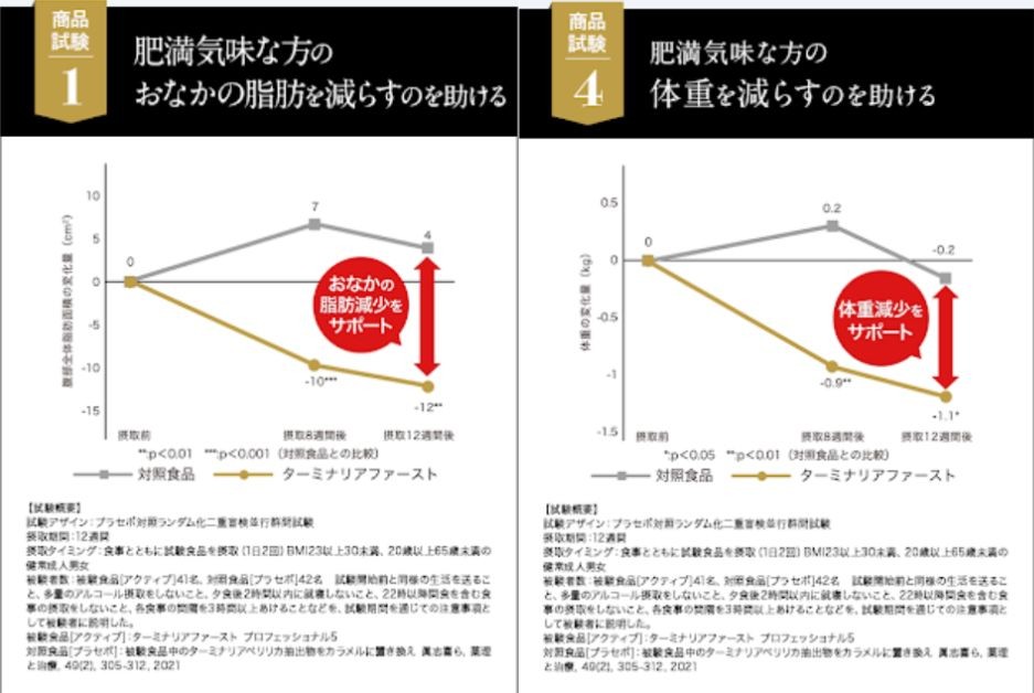 特に「体重」や「お腹の脂肪」の臨床試験では、たった12週間でこんなにも差が!