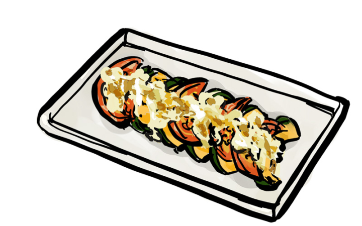 GABAが豊富なかぼちゃとトマトと、トリプトファンが豊富なチーズを合わせた一品。自然な甘みと酸味、チーズのコクが調和し、夕食にも軽い夜食にもぴったりです。