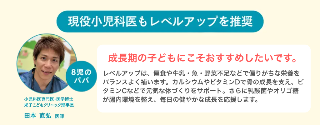 「他の栄養飲料を試したことがあるが、あまり味が合わず続かなかった。でもレベルアップなら美味しいから毎日飲める!」という声もいただいており、お子さまの成長期を今よりもっと強力にサポートできる1杯に仕上がっています!今まで以上にお客様のお役に立てる存在となり、お子さまの成長を願うお父さんお母さん、また成長期の全てお子さまの“明日の可能性を広げる”一助になることができれば幸いです。