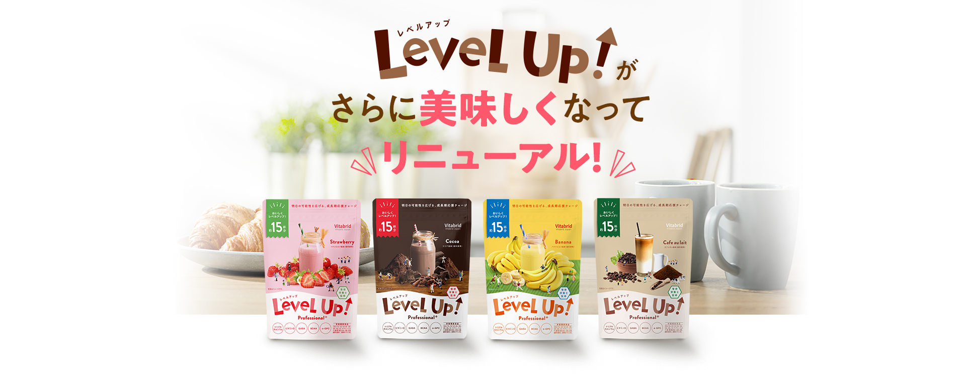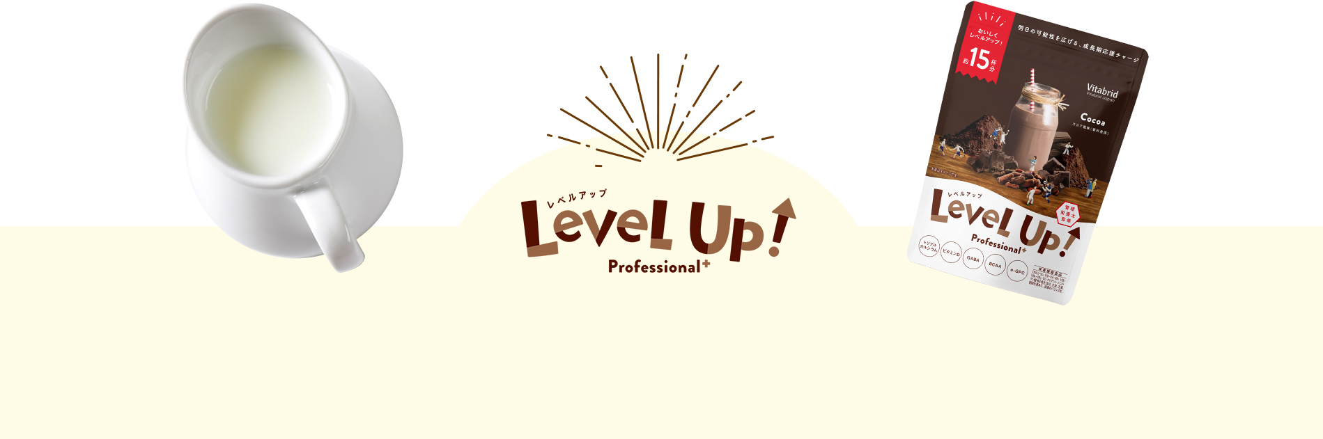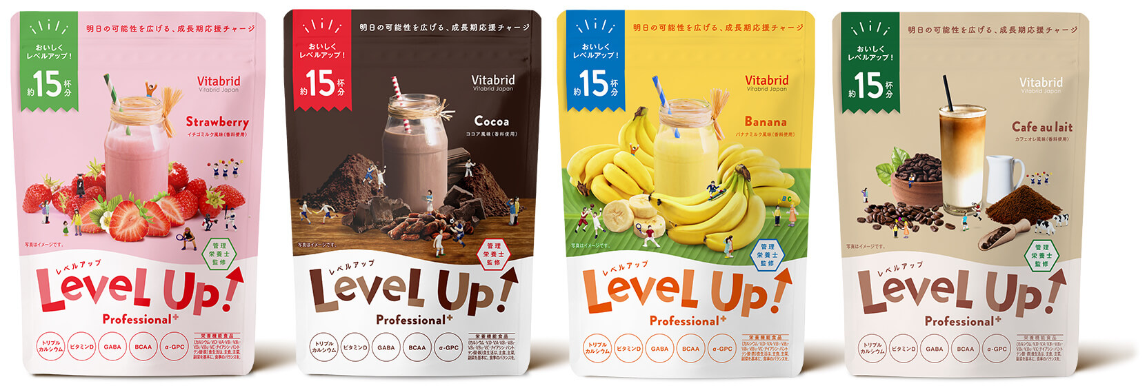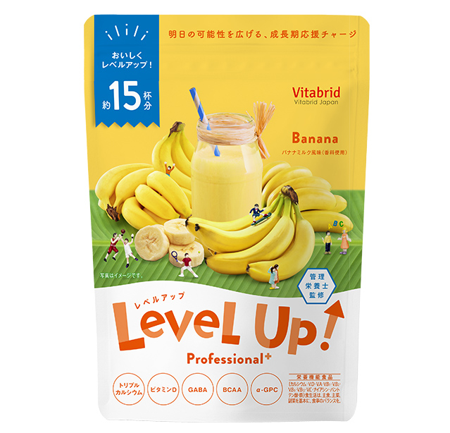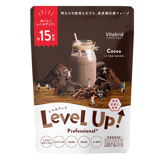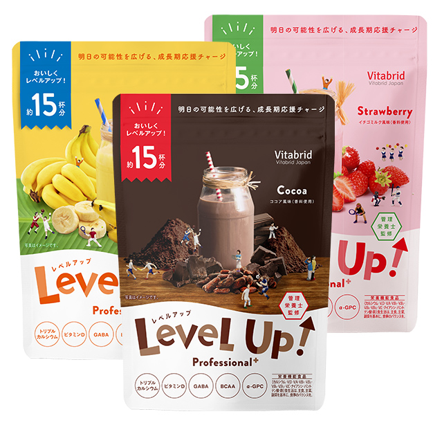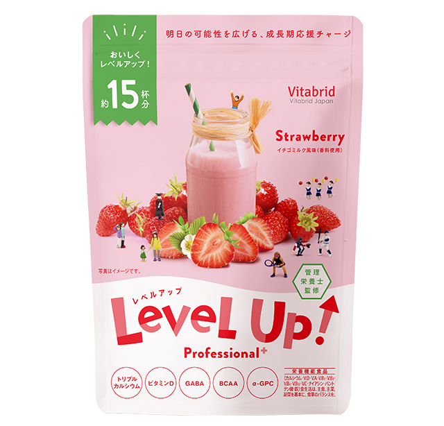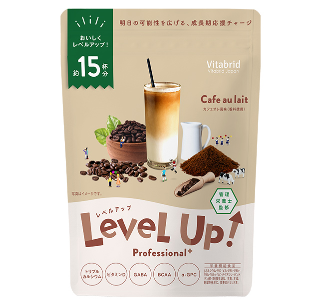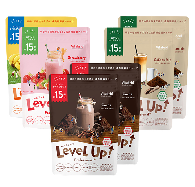 〈レベルアップ〉は1日1杯*1を目安にお召し上がりいただくことで、成長期*2に不足しがちな栄養を補うことのできる食品です。お子さまの様子に合わせてお召し上がりください。もちろん大人の方も日々の栄養補助としてお飲みいただけます。