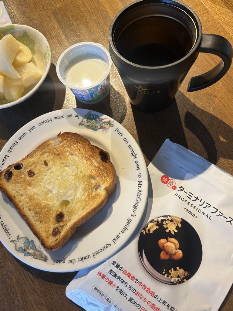 ターミナリアファースト飲むようになって4年がたちます。糖質制限は結構やってますが気になりながらもパンが大好きでなかなかやめられない。それでも朝の食パンだけくらいはいいかな?とターミナリアと一緒に食べてます。朝食はいつもパン一枚、ヨーグルト、果物、コーヒーです。ターミナリアはお守りがわりですね!